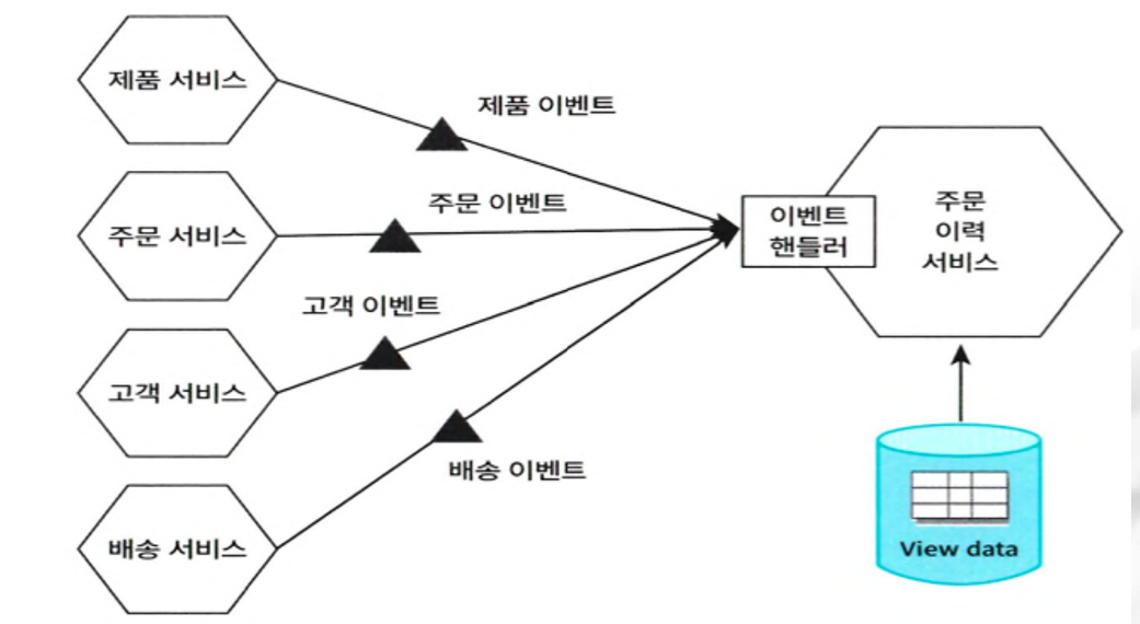 → 주문 이력 서비스를 제공하는 Micro Service가 독자적인 저장소를 갖도록 만들고 주문 이력의 세세한 원천 정보를 보유하고 있는 각각의 서비스도 독자적으로 자신의 저장소를 가지고 서비스를 제공하고 있고 이 원천 정보를 보유한 여러 Micro Service는 자신의 서비스의 정보가 변경되는 시점에 변경 내역을 각자의 변경 이벤트로 발행