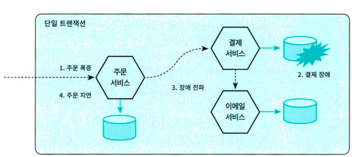 → 실시간성을 강조해서 결제 서비스에서 발생한 장애가 다른 서비스의 가용성을 떨어뜨린 사례로 결제 서비스의 장애로 주문 서비스마저 사용할 수가 없는 것