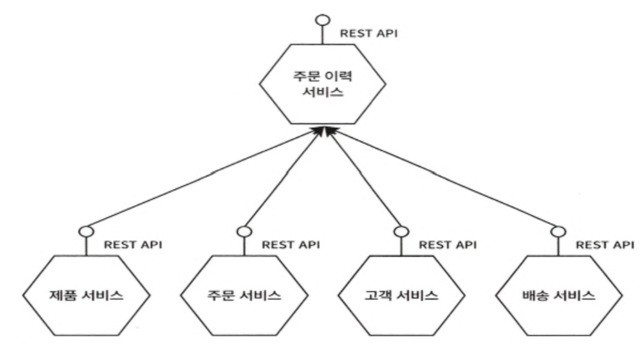 → 주문 이력 서비스는 제품 서비스가 제공하는 제품 정보, 주문 서비스의 주문 정보, 고객 서비스의 특정 고객 정보. 배송 서비스의 배송 정보가 모두 다 필요하기 때문에 각 기능을 제공하는 Micro Service를 조합하는 상위 Micro Service를 만들어 조합된 기능을 제공할 수 있음