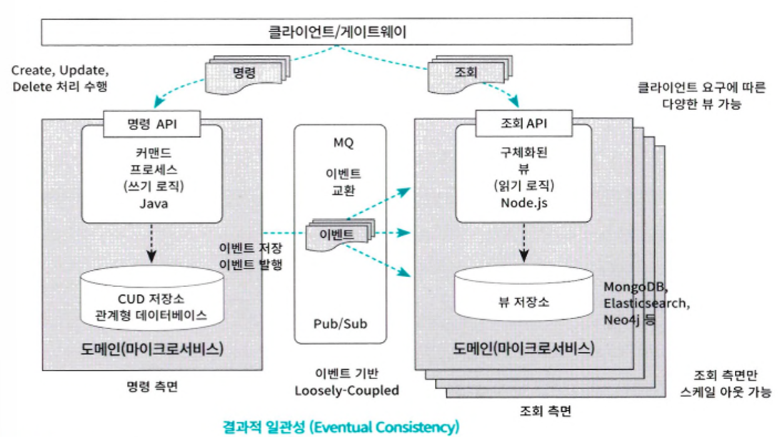 → 명령 서비스에 데이터가 들어간 즉시 조회 서비스의 데이터와 일치할 수 없고 시간적 간격이 있을 수 있지만 어느 시점이 되면 결과적으로 일치하게 되는데 이는 앞에서 언급한 결과적 일관성을 추구하는 것