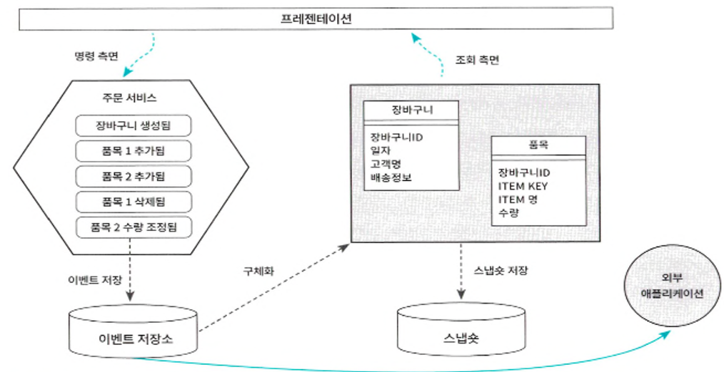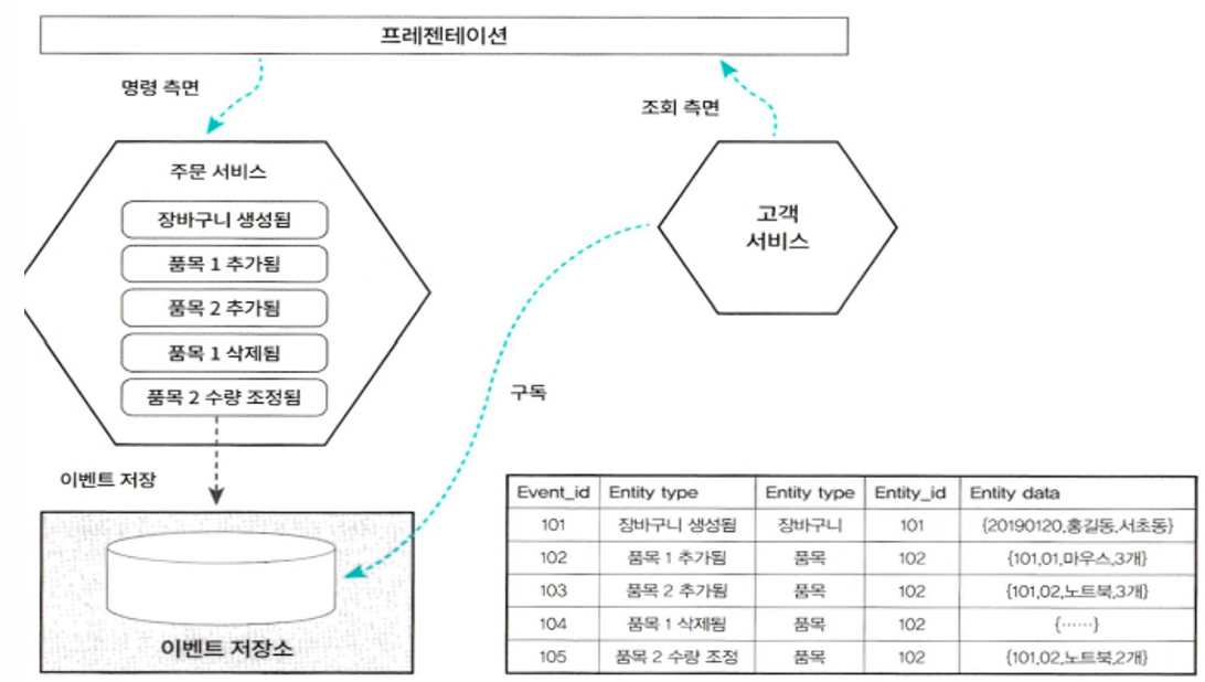 ⊙ 또 한 가지 중요한 점은 명령 측면과 조회 측면의 서비스가 이벤트 저장소에 대한 CRUD를 모두 처리할 필요 없이 입력/조회(CR) 만 처리하면 된다는 것