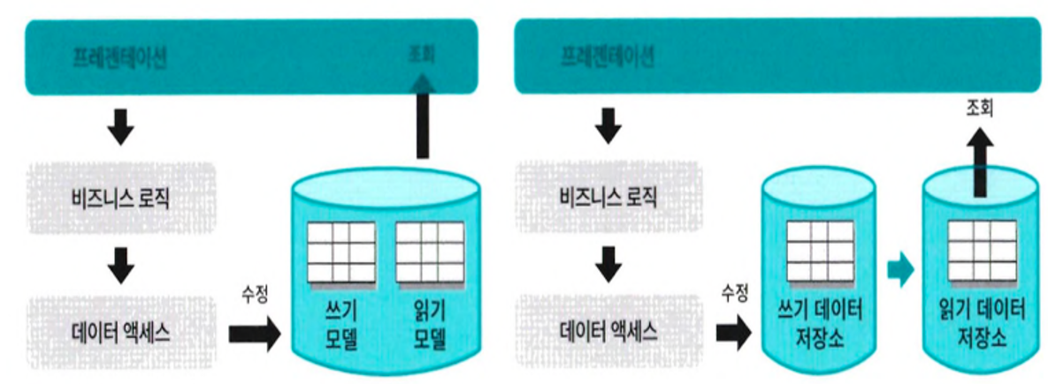 ⊙ 하나의 저장소에 쓰기 모델과 읽기 모델을 분리하는 방식으로 변화시켜 쓰기 서비스와 조회 서비스를 분리할 수도 있고 더 나아가 아예 물리적으로 쓰기 트랜잭션 용 저장소와 조회 용 저장소를 따로 준비할 수 있음